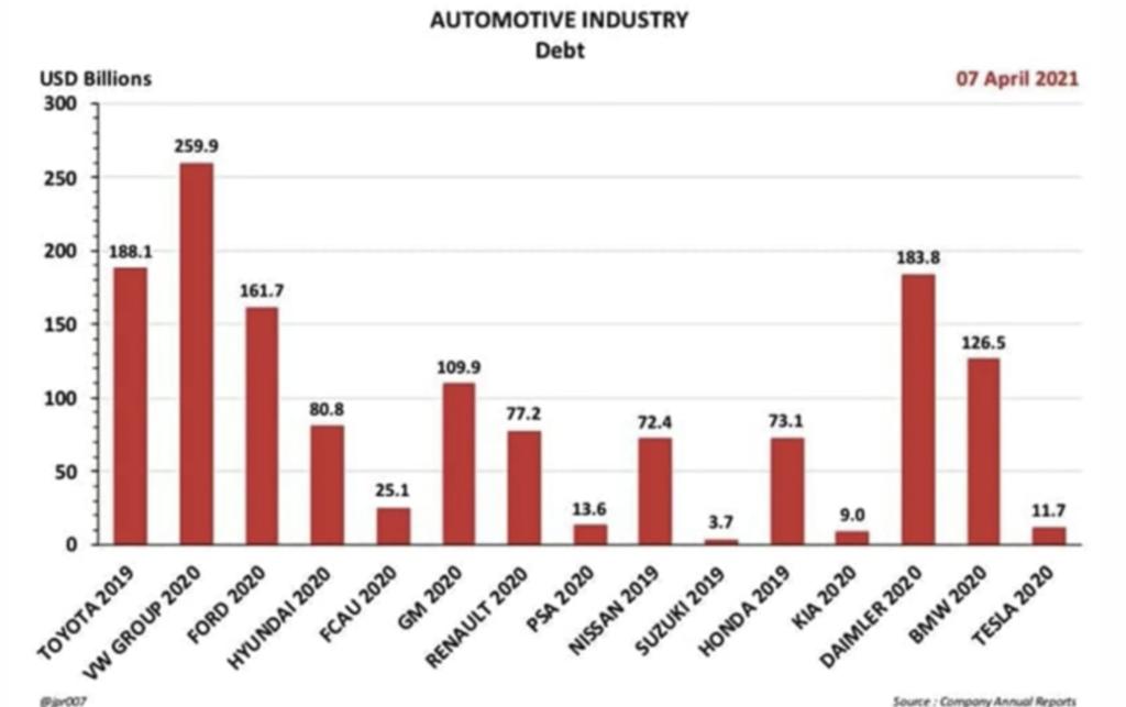 I don’t think this analysis is great. We have to look at the assets of the company, not just debt. It might be that legacy car companies have finance subsidiaries (VW, BMW, Ford etc.) that effectively borrows money, build a car and then sell it on credit to a customer. So sure, they have debt, but they also have a debtor asset.