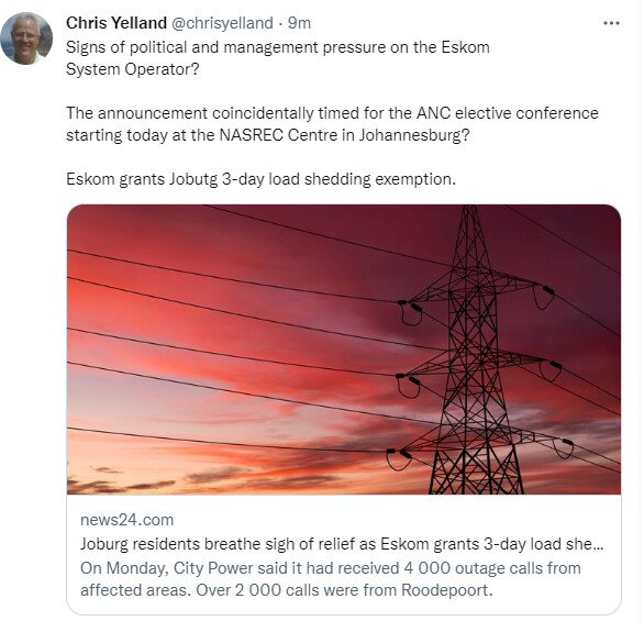 One theory I was suggested is that Mantashe, not looking so favorable, even Union booing him off stage, in light of what De Ruiter has been reporting the last while, saying it how it is, with Mantashe named a time or two ito renewables and bid-windows laying on his desk and whatnot.