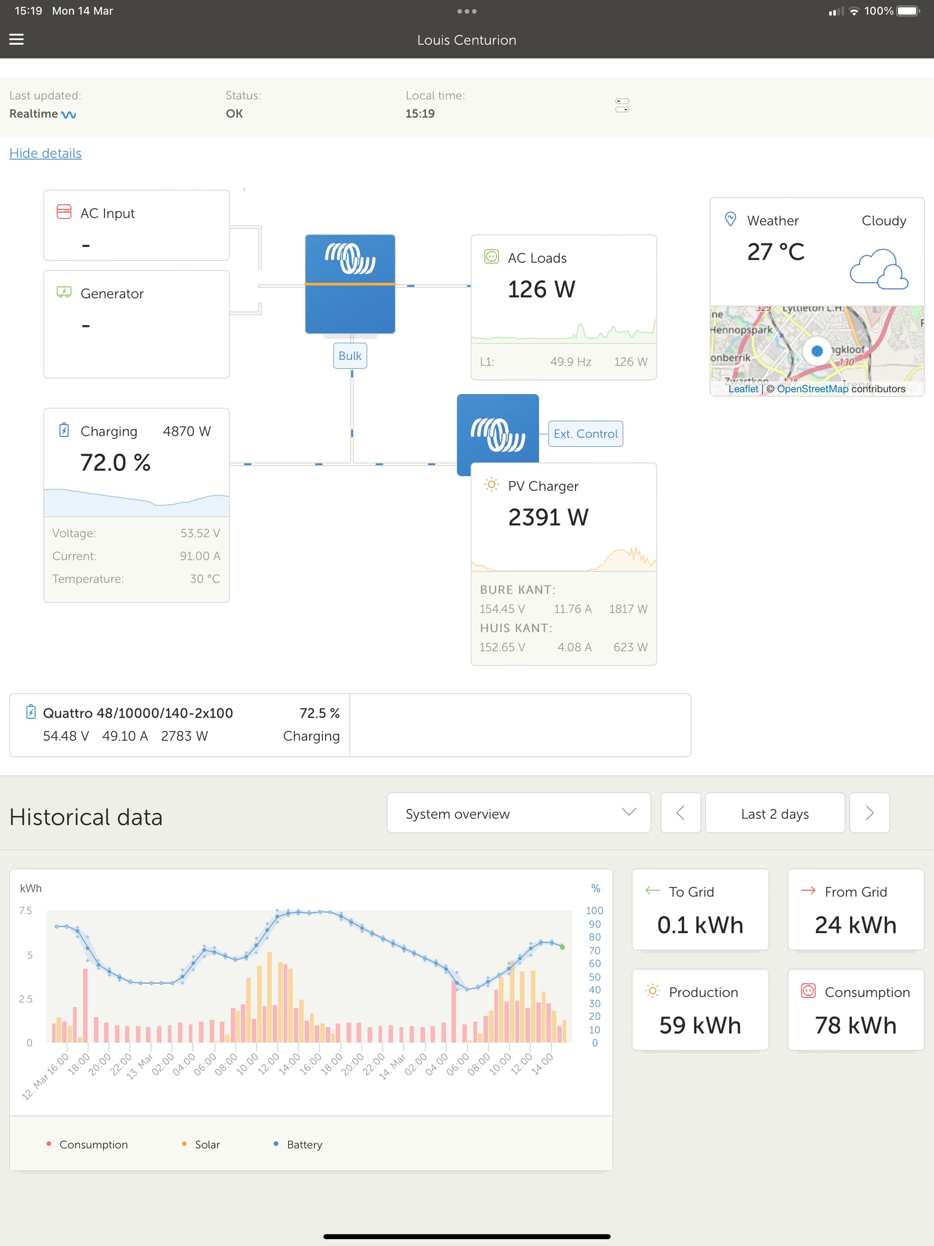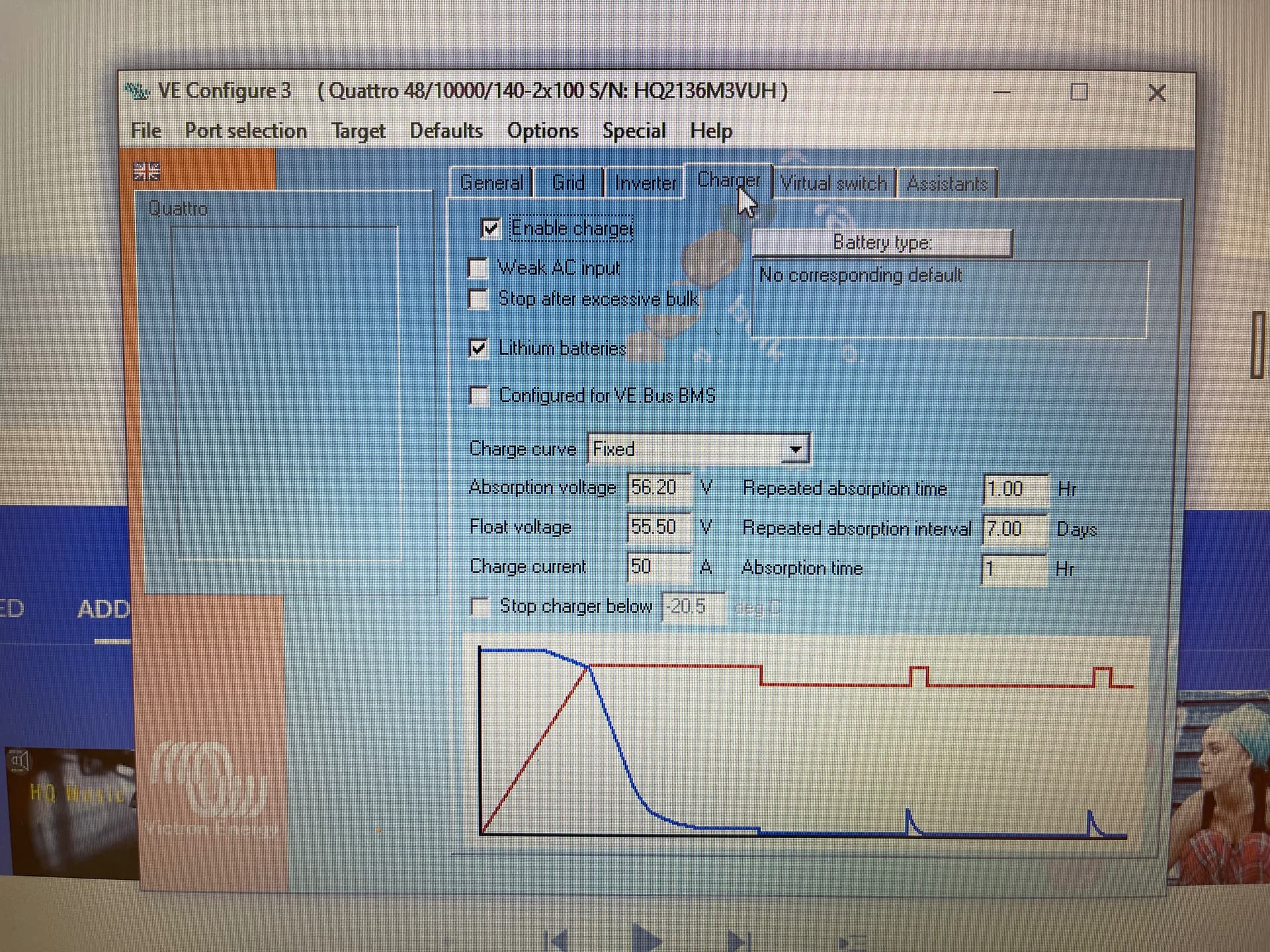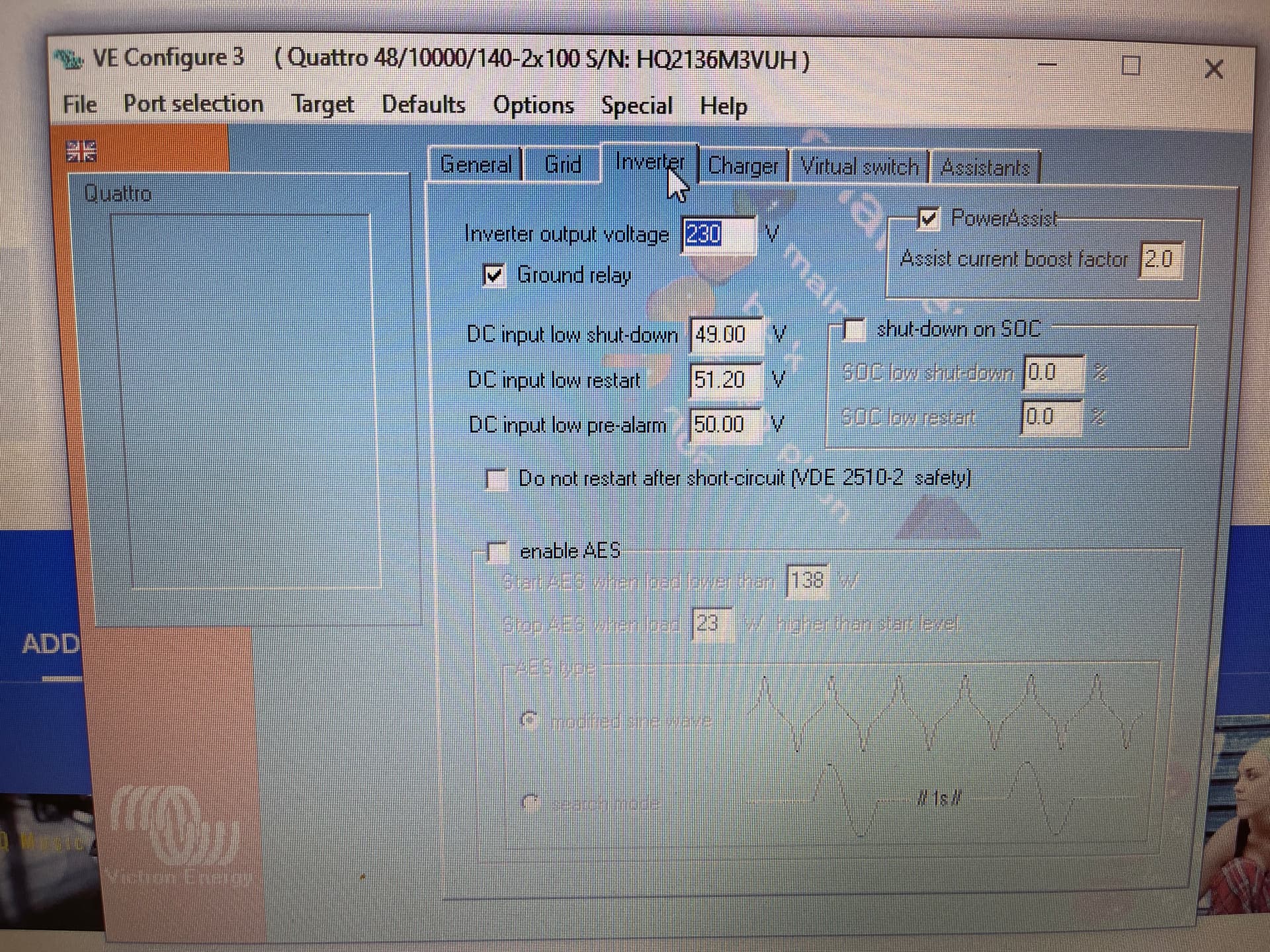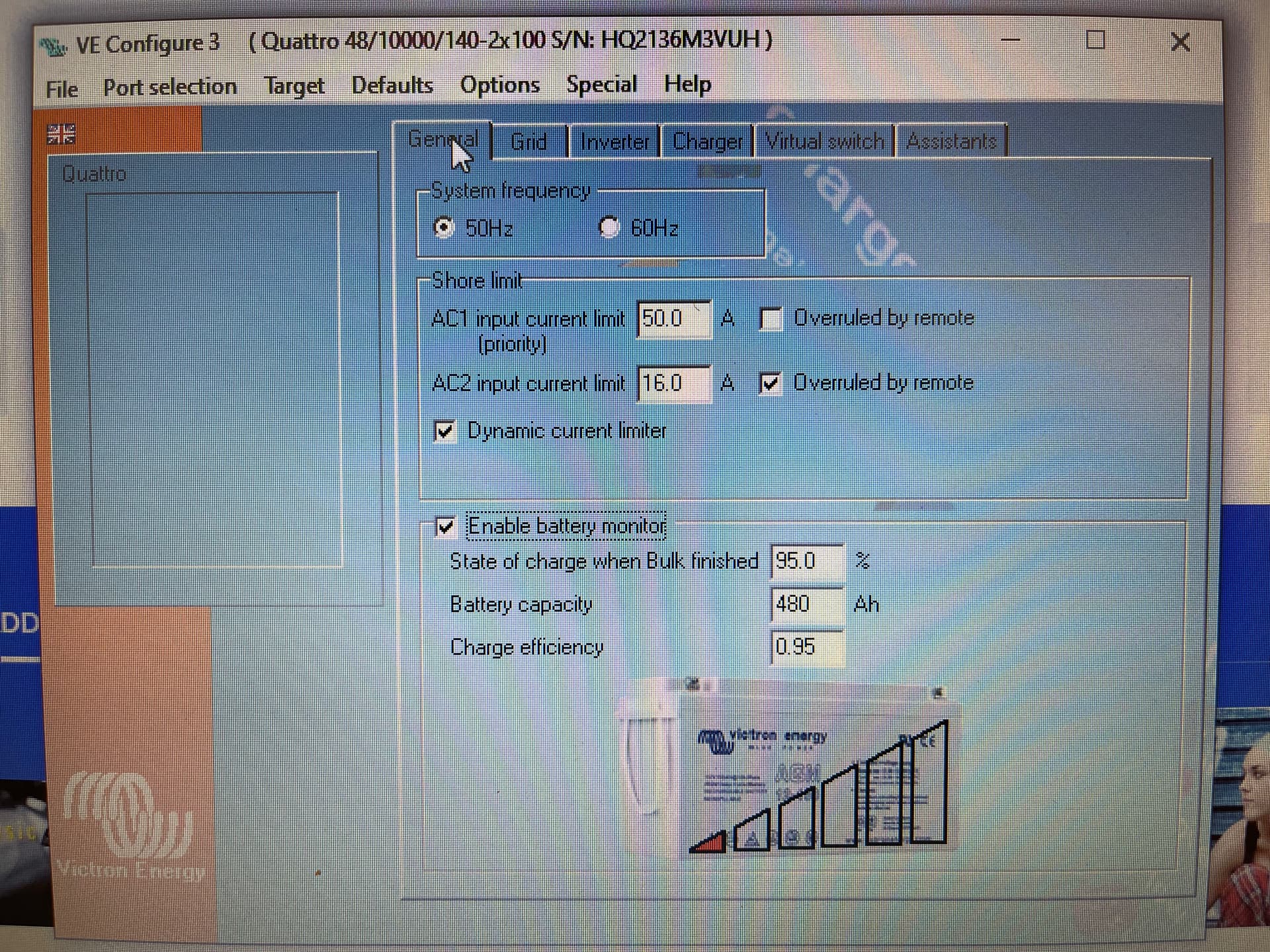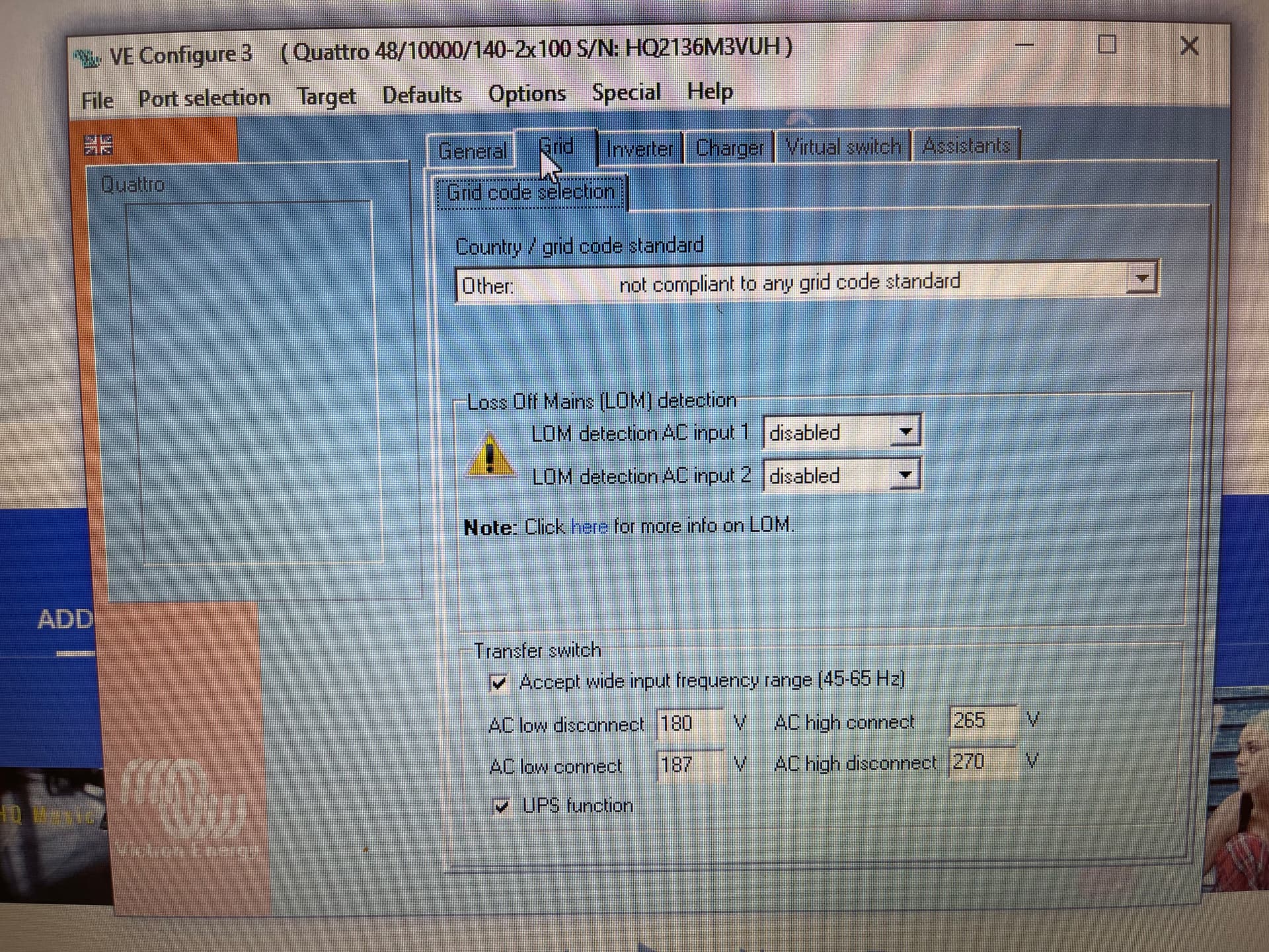 OK my installer still needs come out this week to have a look again but for one or other reason we can not get the Generator to work correctly. As soon as I switch from Grid(AC1) to Generator(AC2) power to the house from the quattro is cut and the generator power is only used for charging the battery. LOM detection is disabled. We played around with many settings like UPS function, power assist, Dynamic current limiter, weak AC etc. but no joy. It is a bit of a bummer because I sepcifically asked for the Quattro to be able to have 2 AC sources. Ohh the Quattro is the 10kva model if it is relevant at all. Generator is connected direct so no relay or self start.